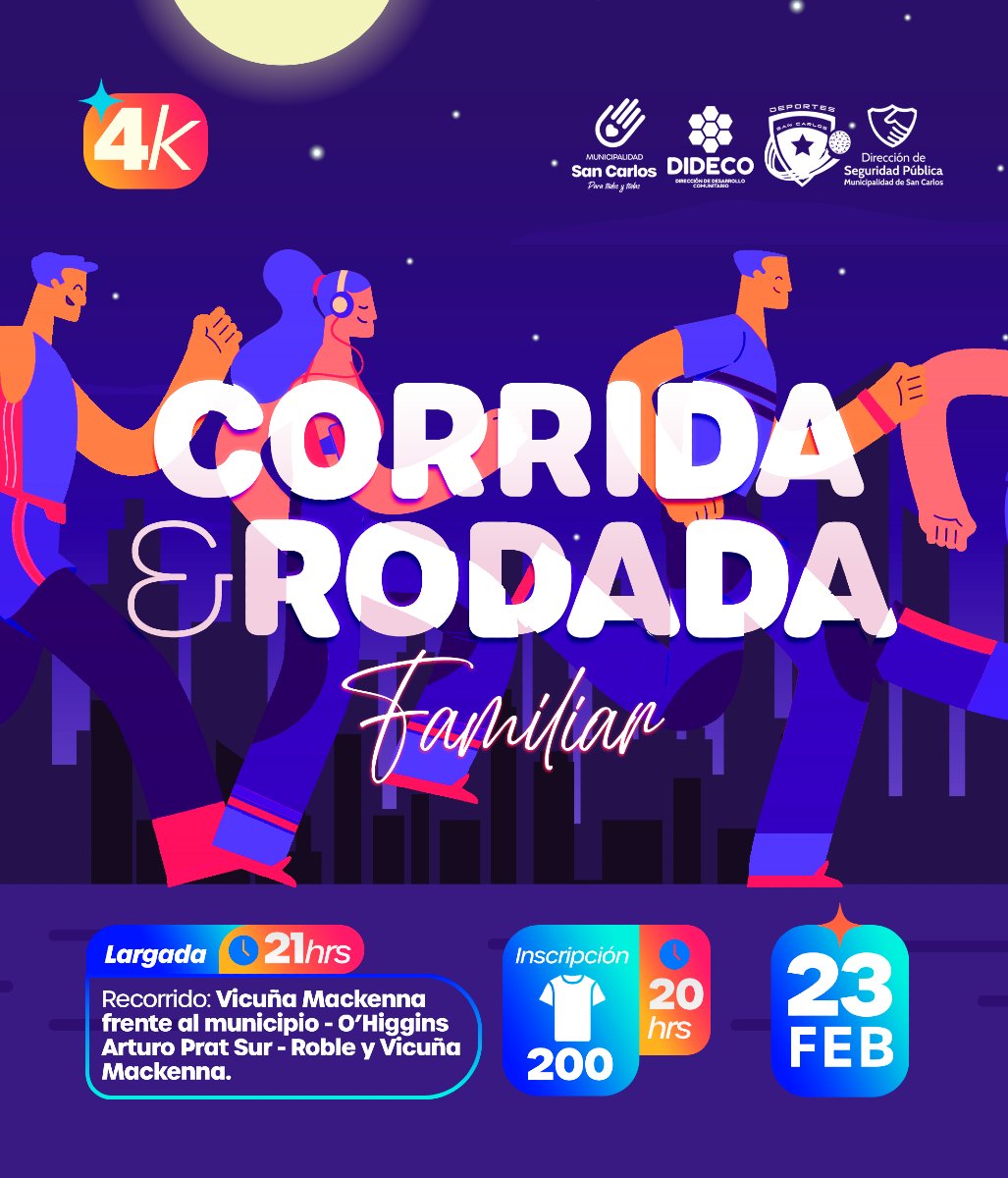 El deporte y la vida sana serán protagonistas en San Carlos con la Corrida & Rodada Familiar 4K, un evento gratuito que se realizará el próximo viernes 23 de febrero. La actividad, organizada por la Municipalidad de San Carlos a través de DIDECO y el Departamento de Deportes, busca fomentar el ejercicio y la recreación en la comunidad.