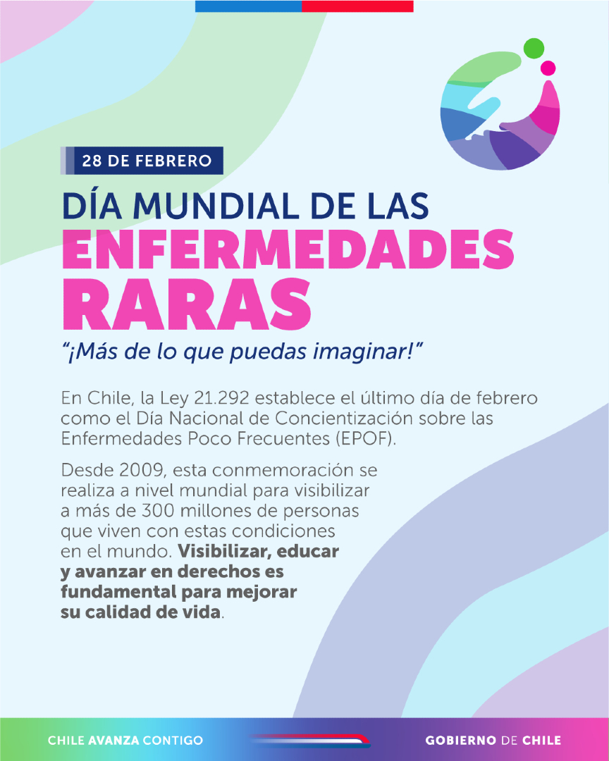 En Chile, la Ley 21.292 estableció el último día de febrero como el Día Nacional de Concientización sobre las EPOF. Además, tras 14 años de tramitación, se promulgó la Ley 21.743 sobre Enfermedades Raras, Huérfanas y Poco Frecuentes, que crea un marco institucional para avanzar hacia un acceso más equitativo a la salud.