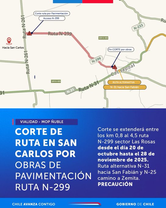 La Dirección de Vialidad del Ministerio de Obras Públicas de Ñuble informó un corte de tránsito en la ruta N-299, sector Las Rosas, en San Carlos, debido al desarrollo de obras de pavimentación a cargo de la empresa Demotrón.