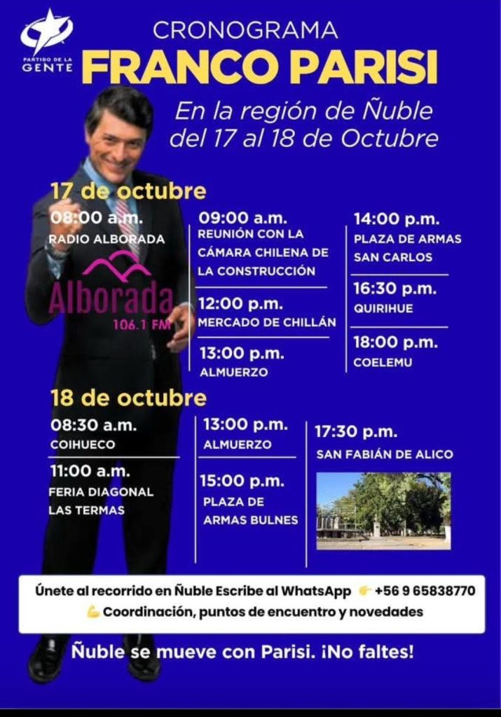 El líder del Partido de la Gente (PDG), Franco Parisi, realizará una gira por la región de Ñuble los días viernes 17 y sábado 18 de octubre, en el contexto de su recorrido nacional rumbo a las elecciones presidenciales 2025. El itinerario considera entrevistas en medios locales, reuniones con gremios y encuentros ciudadanos en distintas comunas.