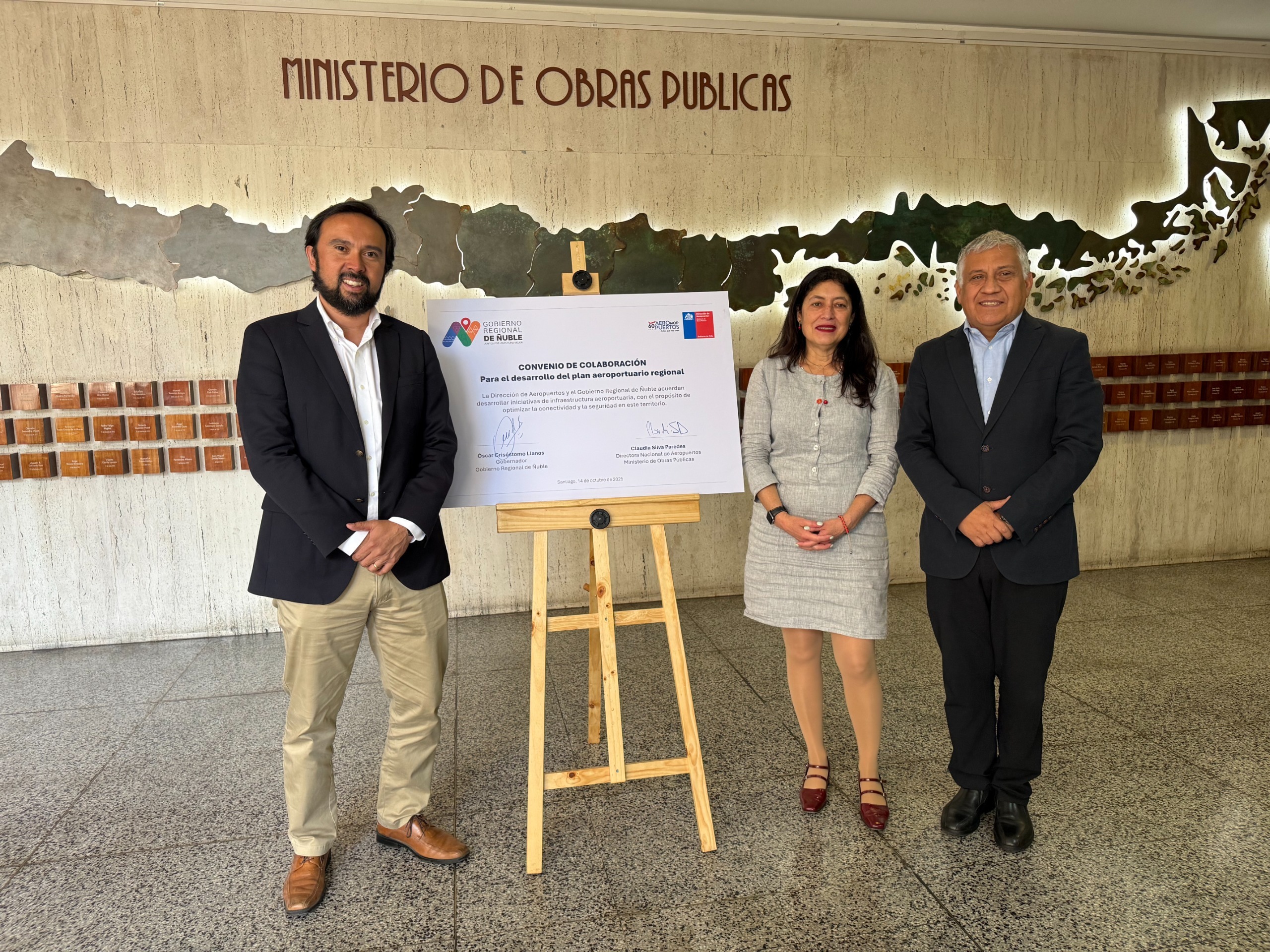 El Gobierno Regional de Ñuble y la Dirección Nacional de Aeropuertos firmaron un histórico convenio que marca el inicio del diseño del Plan Aeroportuario de Ñuble, una hoja de ruta que definirá el desarrollo de aeródromos, pistas, terminales y equipamiento estratégico en las provincias de Diguillín, Punilla e Itata.