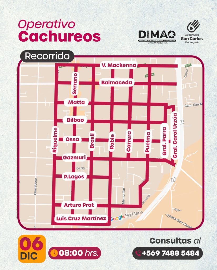 La Municipalidad de San Carlos, a través de la Dirección de Medioambiente, Aseo y Ornato, anunció la realización de un nuevo Operativo de Cachureos correspondiente al Cuadrante N°2. La jornada se desarrollará este 06 de diciembre desde las 08:00 horas, con retiro por las calles principales del sector.